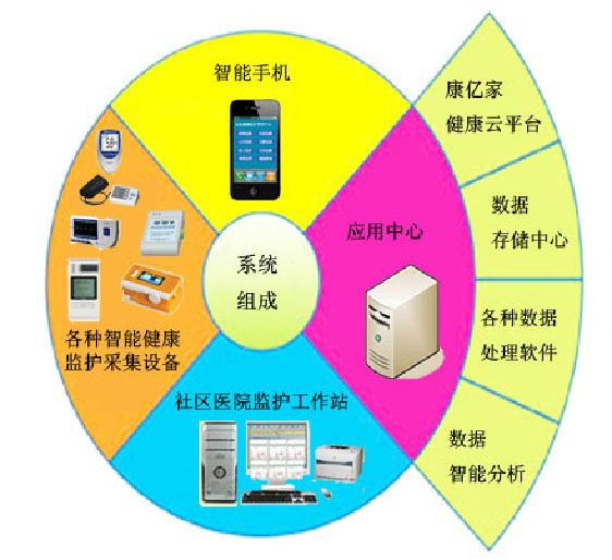 系統(tǒng)主要有各種智能健康醫(yī)療設備采集終端、智能手機客戶端、社區(qū)醫(yī)院監(jiān)護系統(tǒng)工作站、康億家智能健康云平臺等應用平臺組成。
