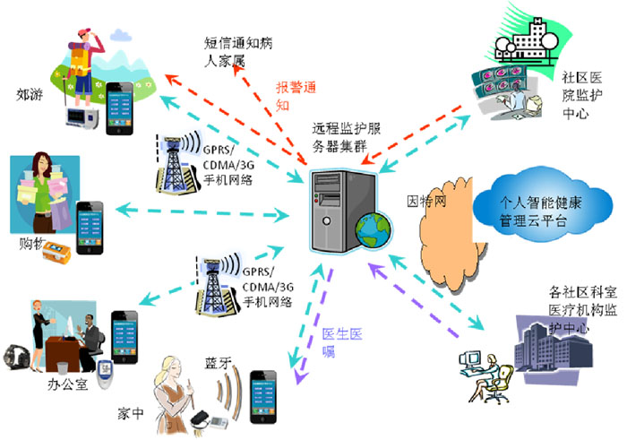 病人可以在家里、馬路上、辦公室、旅游、購物各種情況下通過隨身攜帶的各種智能監(jiān)護采集設備實時進行人體各種生命信息采集,智能手機程序?qū)崟r接收采集設備數(shù)據(jù),進行實時分析和心電顯示,同時發(fā)送到社區(qū)醫(yī)院監(jiān)護服務中心,醫(yī)生進行各種監(jiān)護數(shù)據(jù)查看分析,并將分析結(jié)果存儲到病人數(shù)據(jù)庫中,如有異常會實時報警。